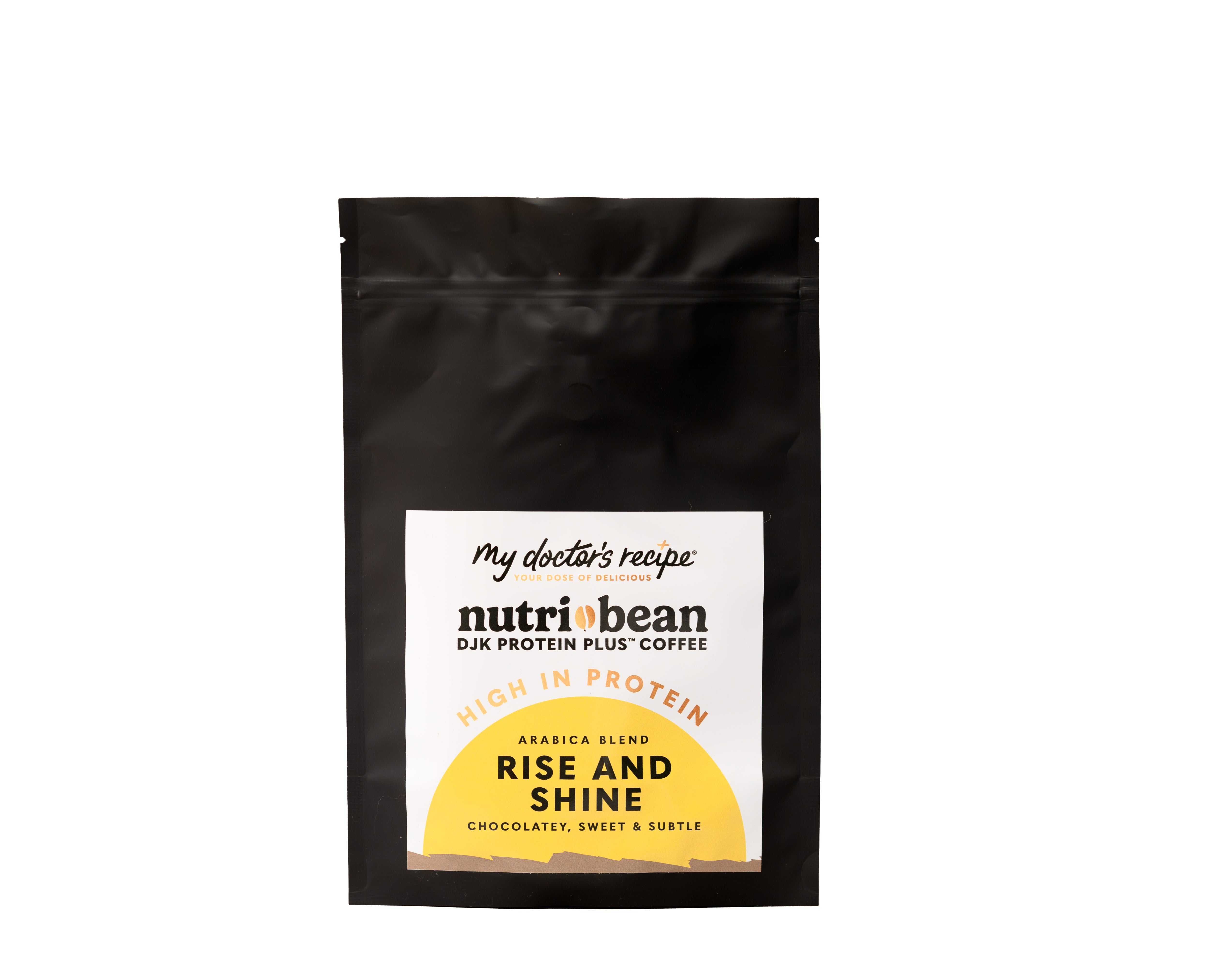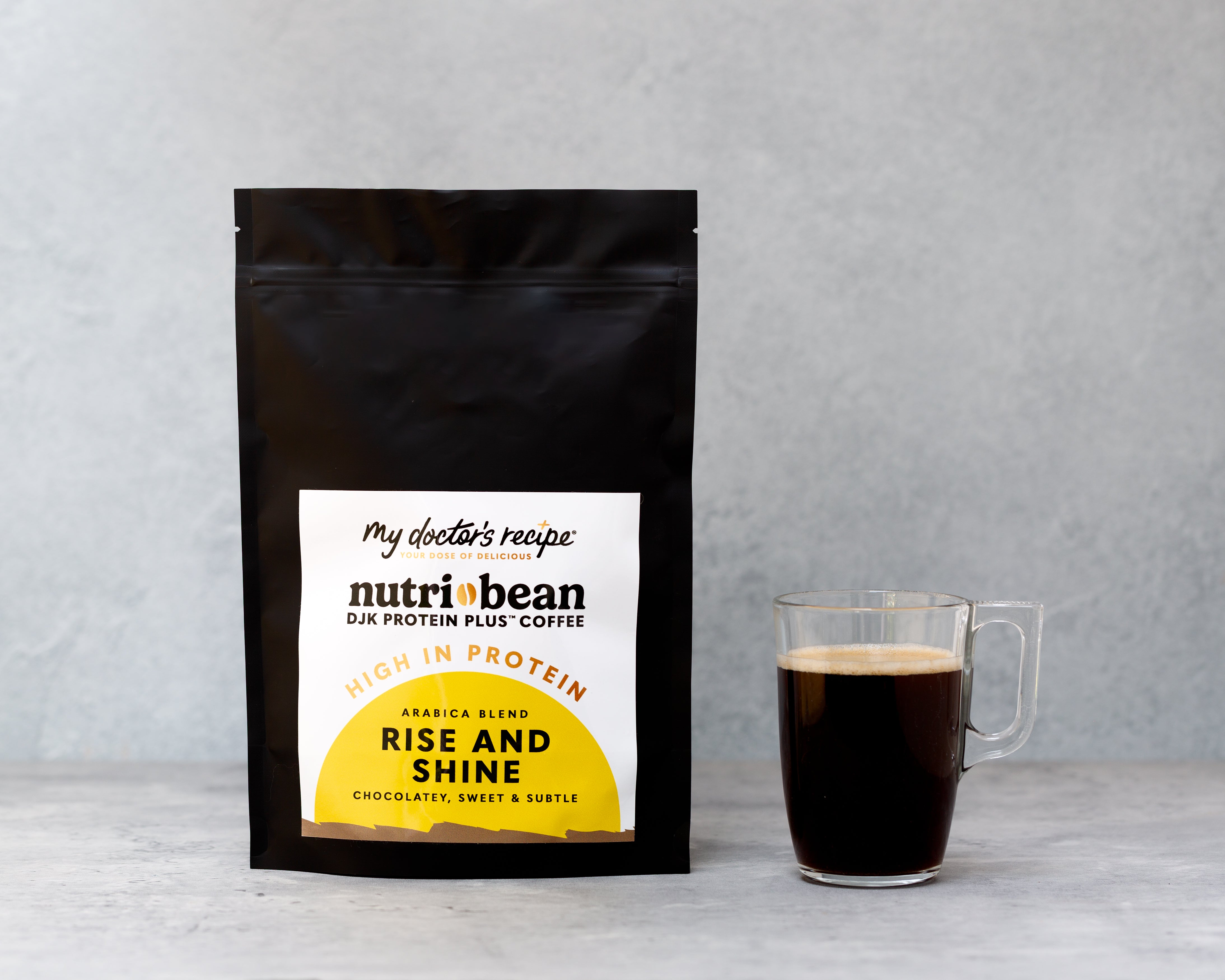 Nutri-Bean® Rise & Shine Coffee is enriched with our DJK Protein Plus®, to help build muscle, repair tissue and provide energy. It also tastes pretty good! Chocolatey and sweet yet subtle. Organic Colombian coffee beans are hand-roasted and fortified to give you a protein boost.