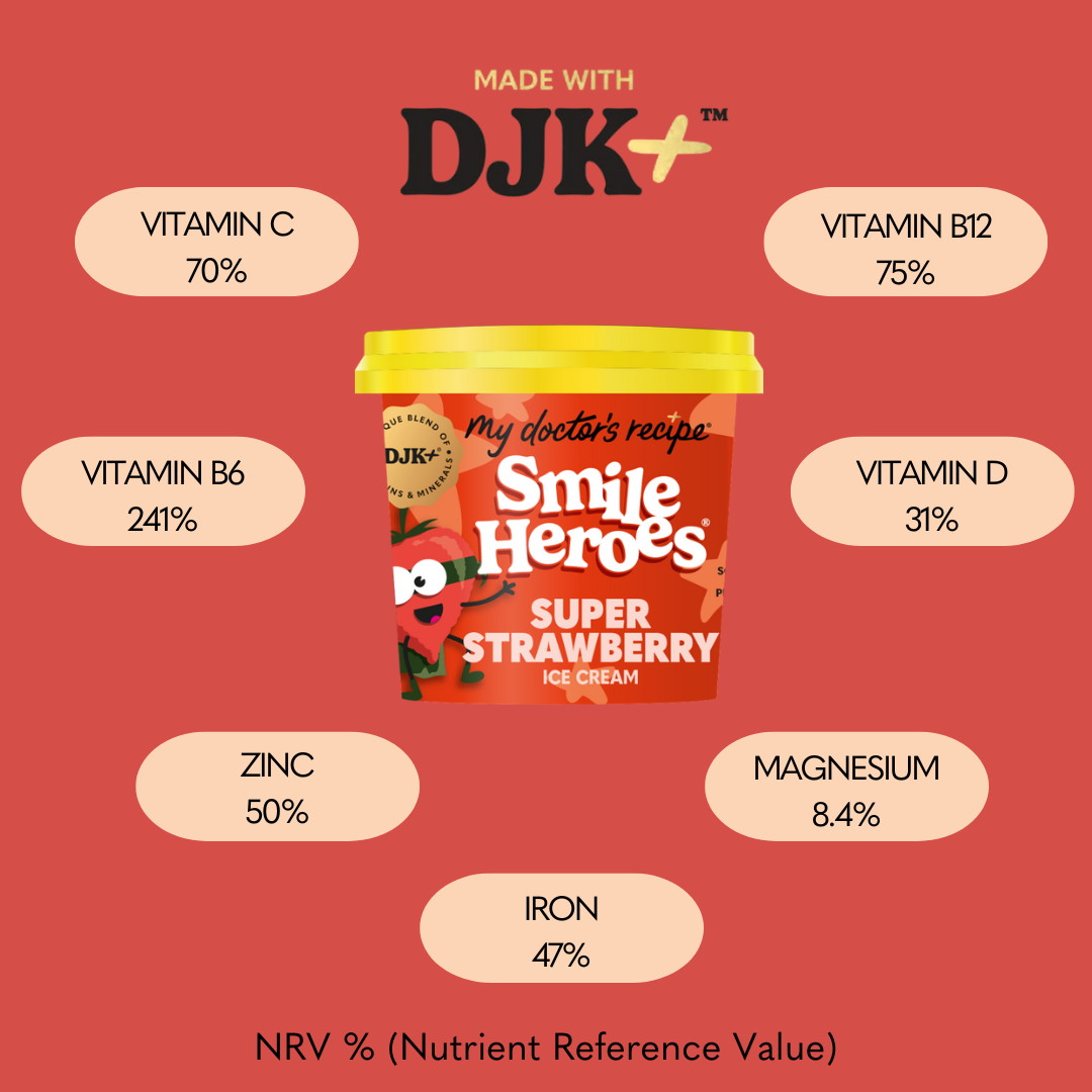 Our co-founder, Dr Jon Krell, developed a unique, game-changing formula known as DJK+® - an encapsulation of essential vitamins and minerals. Each tub of Nutri-Ice®, Nutri-Scoop® and Smile Heroes® is enriched with over 30% of the NRV (Nutrient Reference Value) for Vitamin D, Vitamin C, Vitamin B12, Vitamin B6, Magnesium, Iron & Zinc.