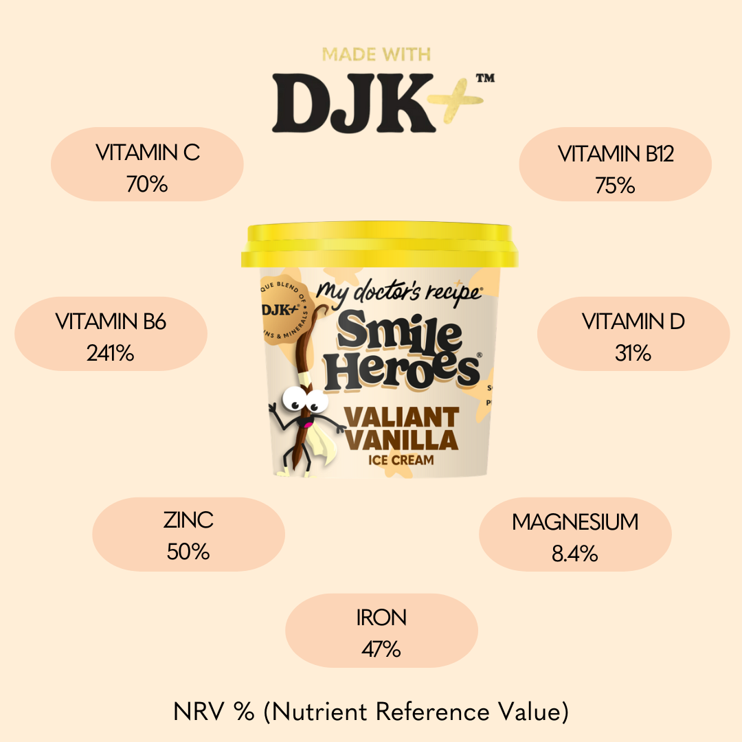 Our co-founder, Dr Jon Krell, developed a unique, game-changing formula known as DJK+® - an encapsulation of essential vitamins and minerals. Each tub of Nutri-Ice®, Nutri-Scoop® and Smile Heroes® is enriched with over 30% of the NRV (Nutrient Reference Value) for Vitamin D, Vitamin C, Vitamin B12, Vitamin B6, Magnesium, Iron & Zinc.