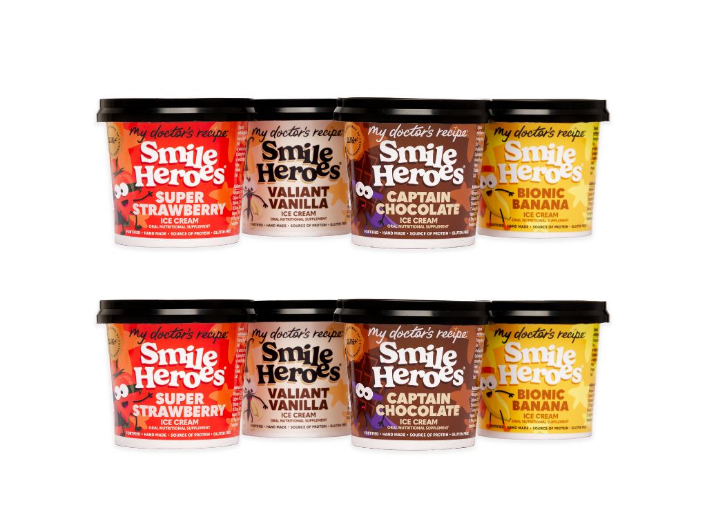Say hello to the easiest way to nourish growing bodies - and make them smile too. The Smile Heroes Super Set includes two pots of each of our four delicious, fortified ice cream flavours for children: 2 x Captain Chocolate, 2 x Valiant Vanilla, 2 x Super Strawberry, and 2 x Bionic Banana.